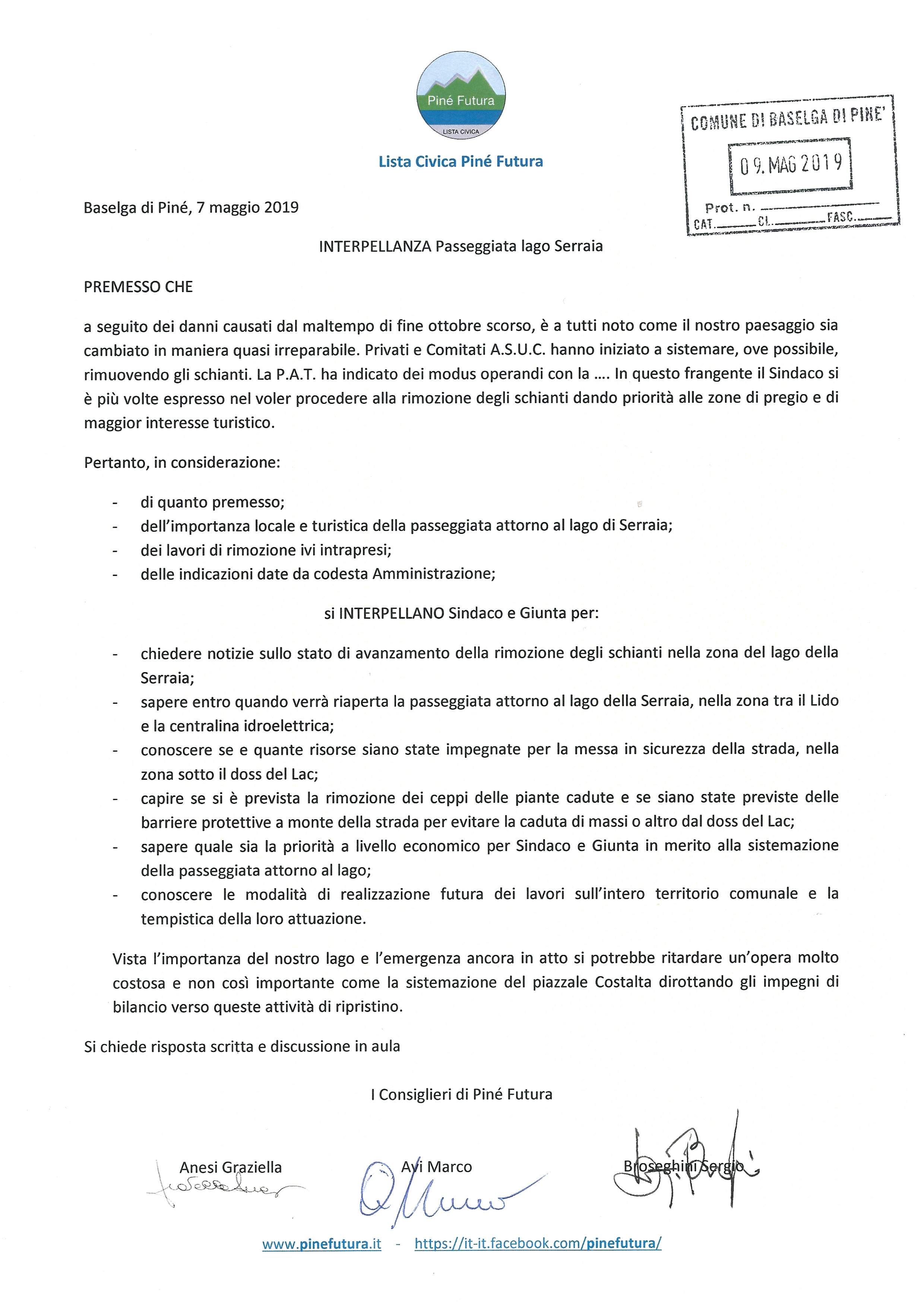 HomeInterpellanzeInterpellanza 09/05/2019: la passeggiata attorno al lago della Serraia Interpellanza 09/05/2019: la passeggiata attorno al lago della Serraia Interpellanze PineFutura11 Maggio 20190